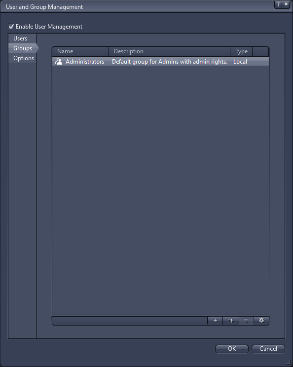 - All available groups are displayed. By default, you have an Administrators group. To manage access rights for user groups, see Managing Access Rights for User Groups.
