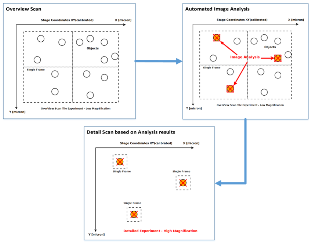 In contrast, the Smart search aims to start close to the likely intensity maximum of the z-Stack. This focus position is approximated by a fast line z-stack in the center of the image frame. As the line scan generates less pixels and a higher noise level, a useful dynamic range needs to be ensured. To this end, the fast line z-stack is repeated several times with increasing PMT gain. After the line scan, regardless if an intensity peak was found or not, a frame wise autofocus will follow.
