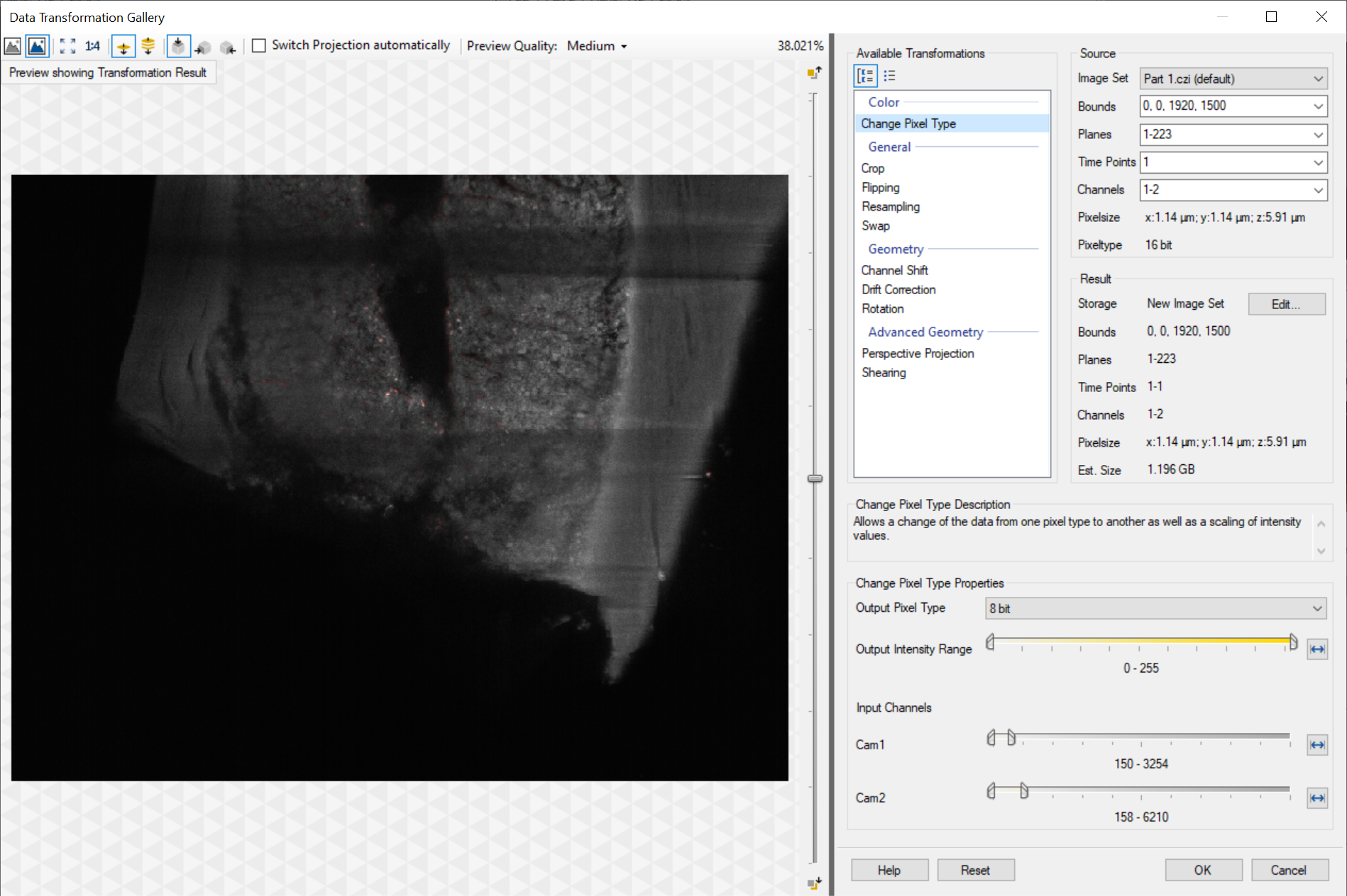 As mentioned above, Volume Fusion works by taking one image set that we define as the Base image set and another that we define as the Moving image set, and transforming the Moving set to match the Base. If both the base and moving image set are similar in size and channels, which is the base and which is the moving set is relatively unimportant. However, if combining images of vastly different resolutions, as one might if combining electron microscopy and light microscopy image, it is worth bearing in mind that the moving set will be scaled to match the base set. This will usually result in the moving set being either scaled up to gigantic proportions (if it is much lower resolution) or scaled down significantly (if it is much higher resolution). Because of this, Volume Fusion is only really useful for multimodal imaging if the two imaging modes produce images of similar resolution.