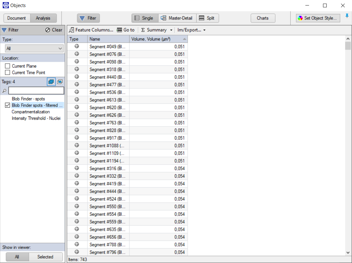 The pipeline purpose is to detect objects, falling in two different classes, using Blob Finder and the Intensity Threshold operator. The detected objects are compared to find partial or total overlap conditions. It can be applied to cells, nuclei or any kind of small particles.