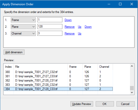 By applying dimension templates to your input files, you can easily define how your images are arranged in the different dimensions which the internal image model provides. If you have, for example, input files for two channels that should be organized as a result dataset with 10 time points and 20 planes, you can configure the dimension order as shown in the following screenshot: