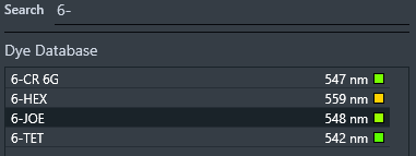 Table with selected channels You can add up to 8 fluorescence channels and contrast methods. The added dyes or the contrast methods are shown in the list. If necessary, change the color by clicking the arrow and select a user defined color. |