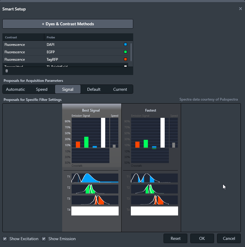 The number and type of proposals depend on the used microscope hardware, the selected dyes, and the contrast method.