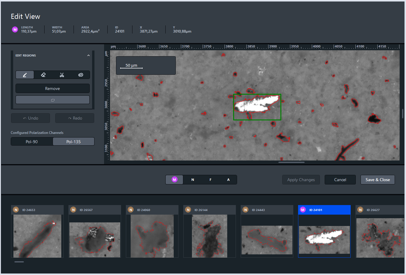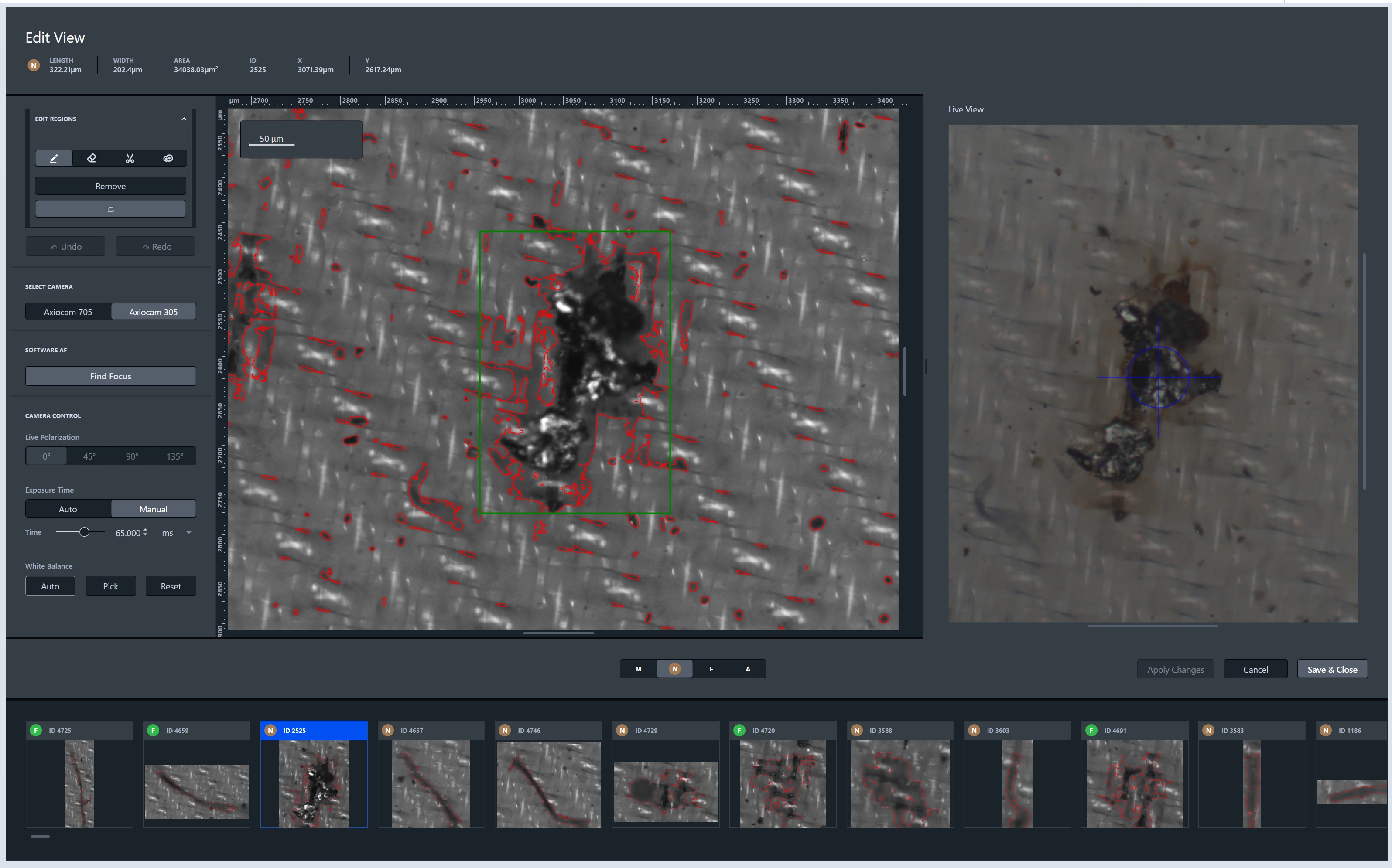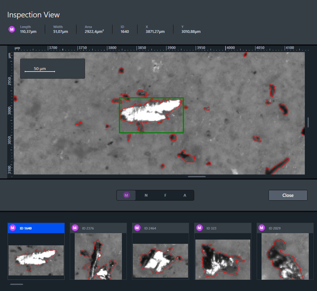 This document opens an inspection view identical to the Size Distribution view to inspect particles, see Inspecting Results. Here, you cannot modify the results.