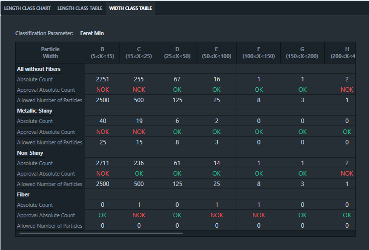 This table informs you about the particle size distribution based on the selected width classification parameter) displayed in the Size Distribution view in the Width Class Table, see Class Chart - Width Class Table.