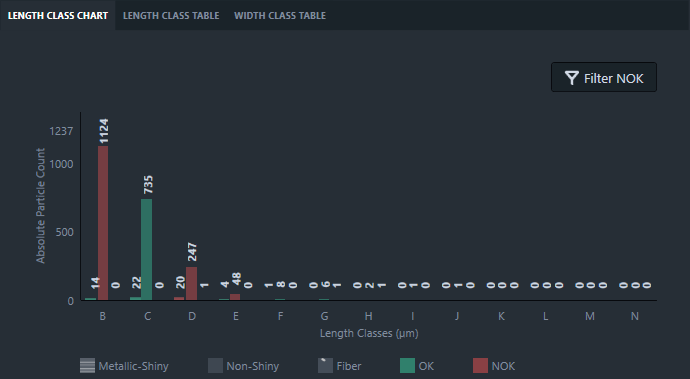 This table informs you about the particle size distribution based on the selected length classification parameter displayed in the Size Distribution view in the Length Class Table, see Class Chart - Length Class Table.