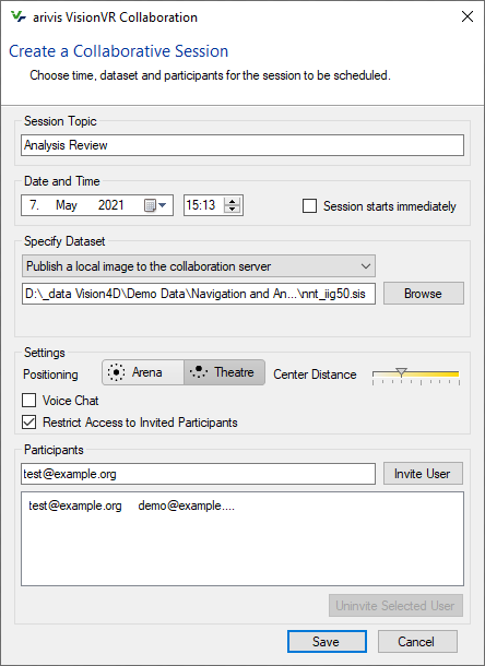 Setting up a collaborative session involves setting up three specific aspects of the session: the dataset to be used and how it will be made available; settings concerning audio communications; and the participants and access.