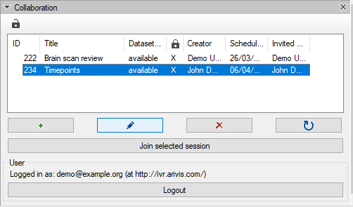 If any parameters of a session need to be modified for whatever reason, you can do so at any time before the start of the session. To do so, start by selecting the session you want to edit in the Collaboration panel and then click Edit (blue pencil icon).