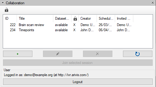 First, an image set is shared with all the users invited to a session and downloaded to each user's machine. When the session is started different users can be either presenters or attendees. Presenters are active handlers of the data and their actions are relayed by the collaboration server to all the other users so that when the presenter moves the dataset it then also moves in the virtual world of all the other participants. A participant can then request to become the presenter and if granted those privileges by the presenter or organizer, this user then becomes the presenter until he relinquishes the presenter role to another user. Users can join and leave a session at will.
